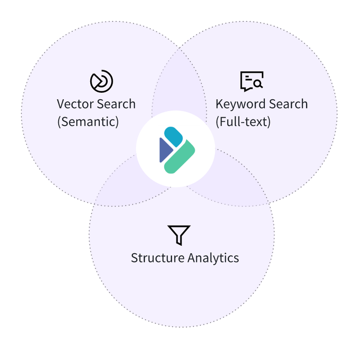 这一根本性变化,对数据库的检索能力提出了全新挑战。传统单一的搜索模式(无论是关键词还是向量搜索)已显不足,在应对复杂多模态的 Agent 查询时,往往在缺乏结果的全面性、语义的精确性以及流程的可控性。而这就要求数据库同时具备三种能力,将结构化分析、文本搜索和向量语义搜索集为一体,实现高效的混合搜索能力。特别是在以检索增强生成(RAG)为代表的应用中,混合搜索能力变得更为关键,已成为避免幻觉、提高相关性与保持实时性的基础能力。