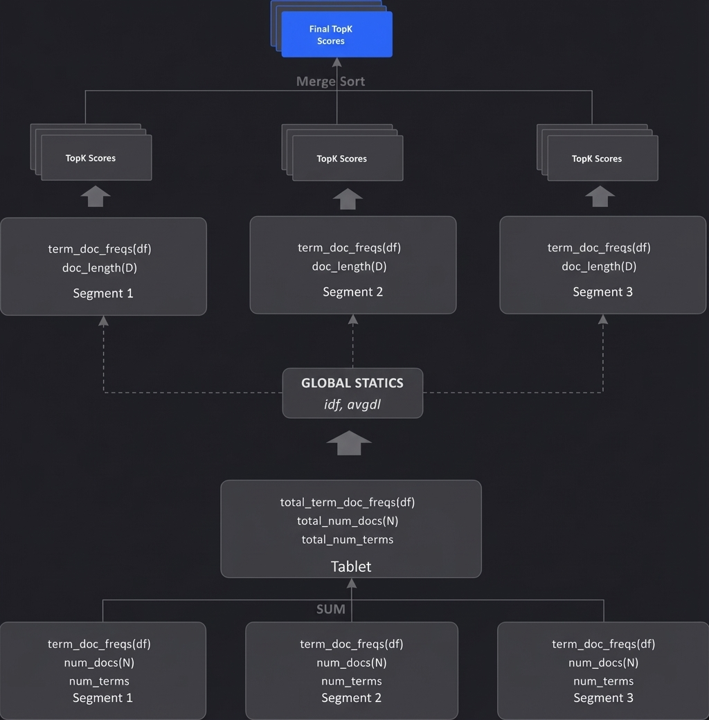 阶段 1:在 Tablet 级别执行,负责遍历所有 Segment 并收集 BM25 计算所需的全局元数据: