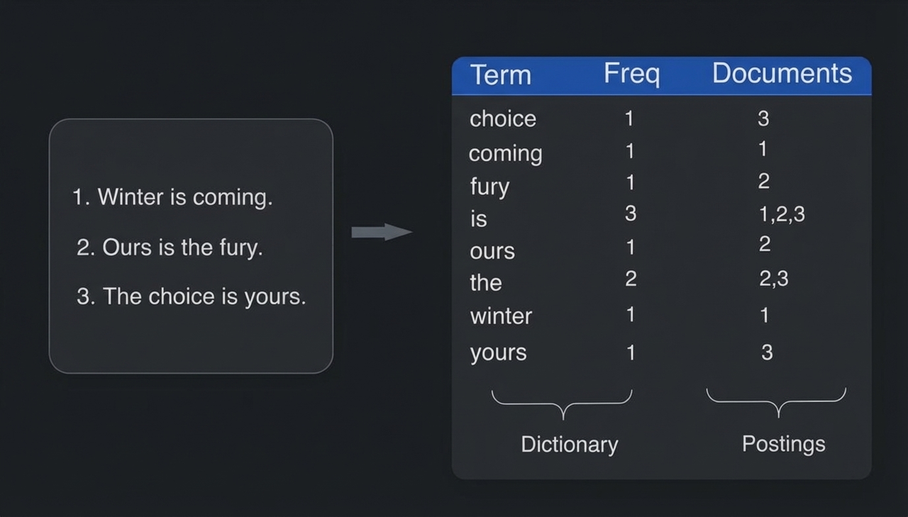 - 统计收集: 累加总文档数 ($$N$$) 和每个词项的全局文档频率 ($$f(qi,D)$$)。
