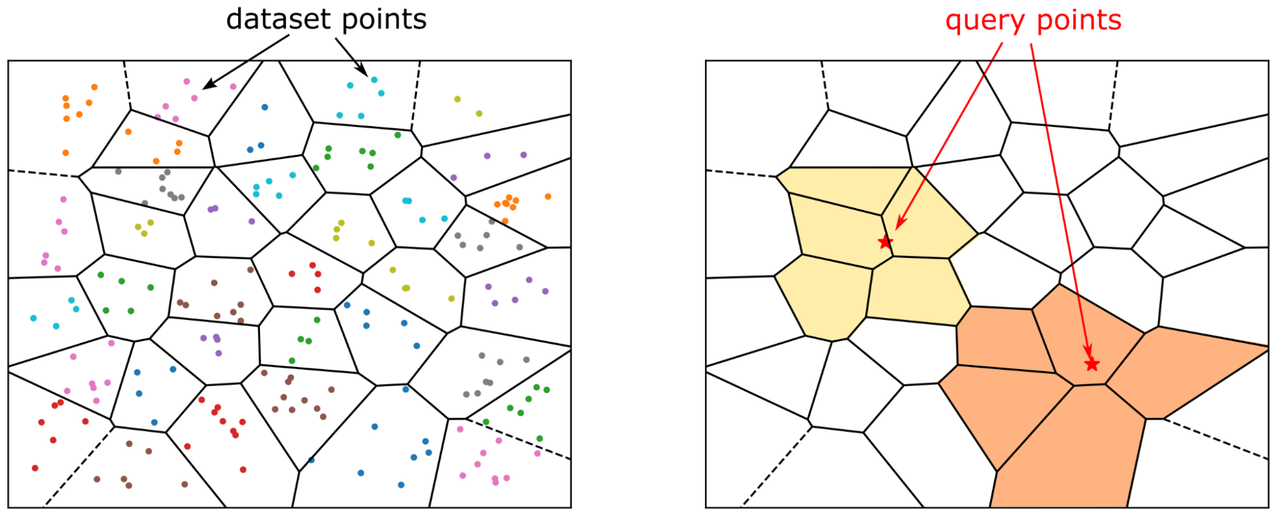 - IVF(Inverted File Index)通过聚类(如 k-means)将向量划分到不同分桶,仅在最相关的分桶中进行搜索。其构建速度快、资源占用低,适合百万至千万级的大规模向量库;可通过