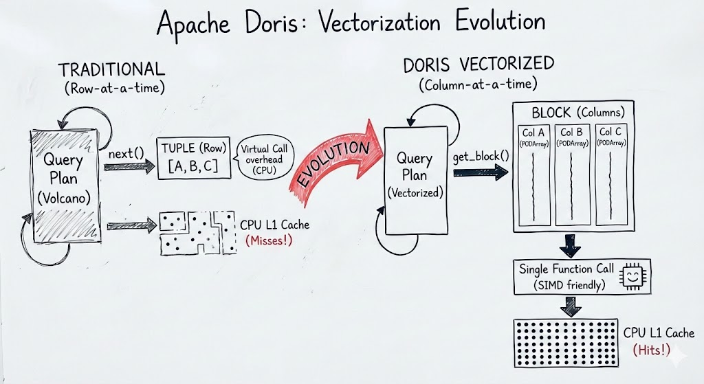 挑战是明确的:如何消除虚函数和分支预测带来的开销?如何让内存访问模式更适配 CPU 缓存?如何在高并发下避免锁与调度成为瓶颈?Doris 的应对策略清晰而系统: