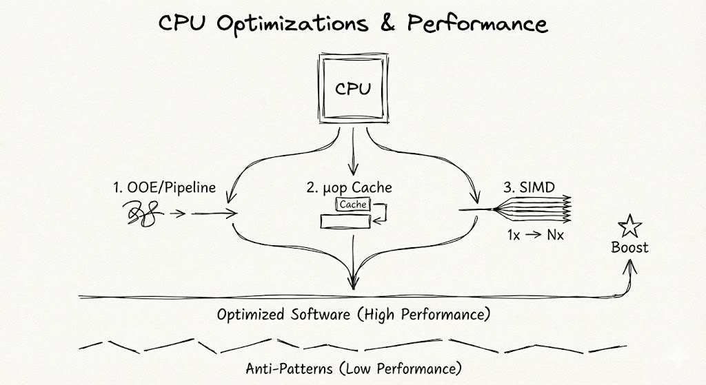 现代的 CPU 架构中,存在着大量激进如“黑科技”般的优化手段,例如指令乱序发射(OOE)、多级流水线、向量指令集(AVX、Neon、SVE)。它们能够使你的代码在同等的算力下性能倍增——前提是,你没有反模式。