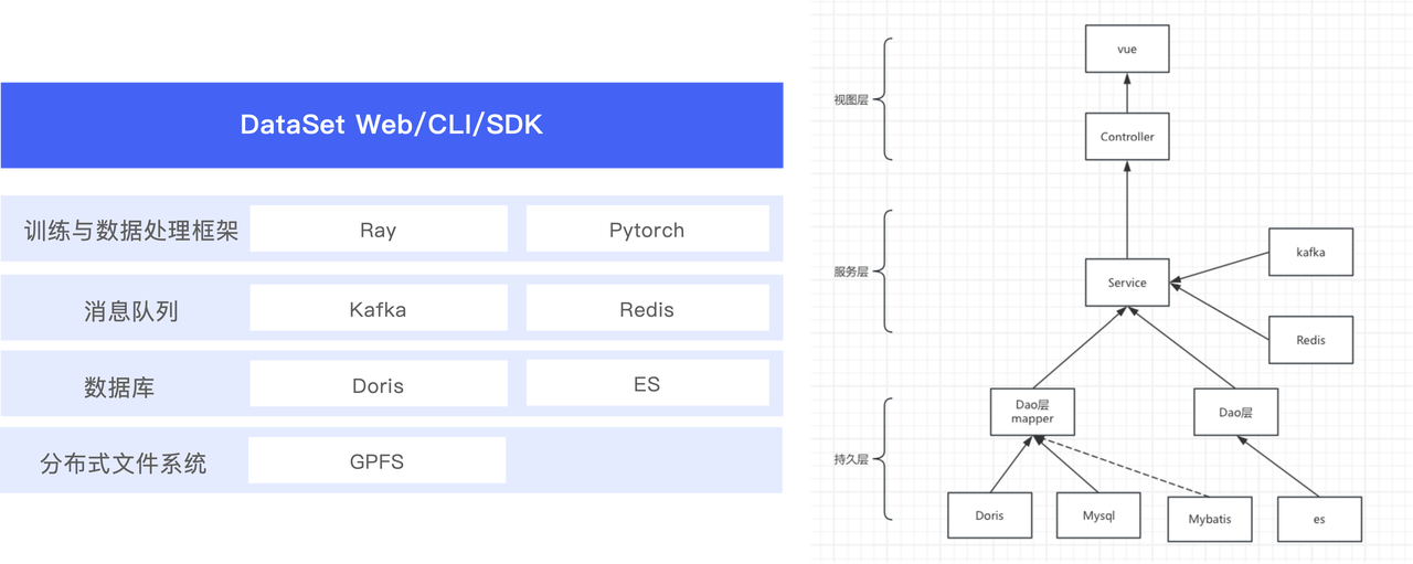 - **数据集管理系统:**经过预处理的数据,汇入 基于 Apache Doris 构建的数据集管理系统(即本文核心) 。该系统是整个 AI 中台的关键,负责数据的版本化存储、管理与发布,为模型训练与测试提供数据支撑。