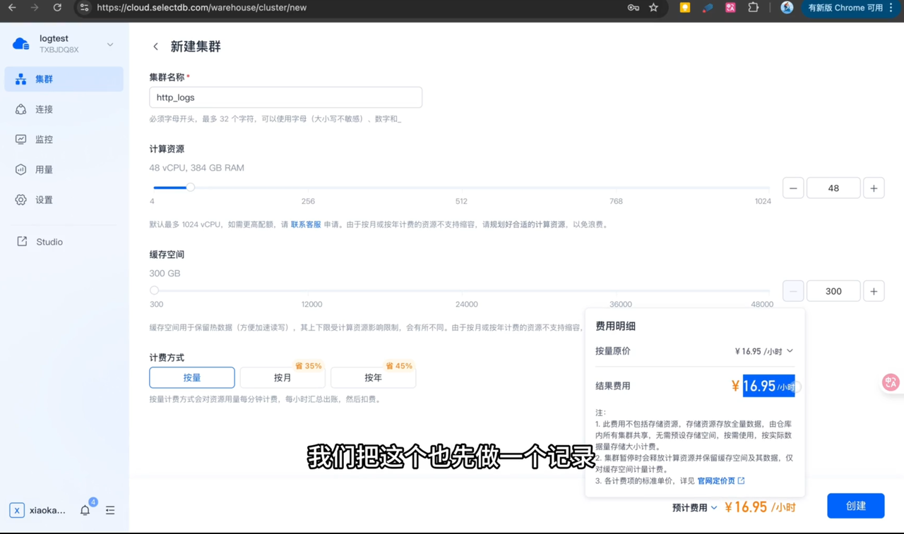 (2)SelectDB Cloud(48c) 费用: