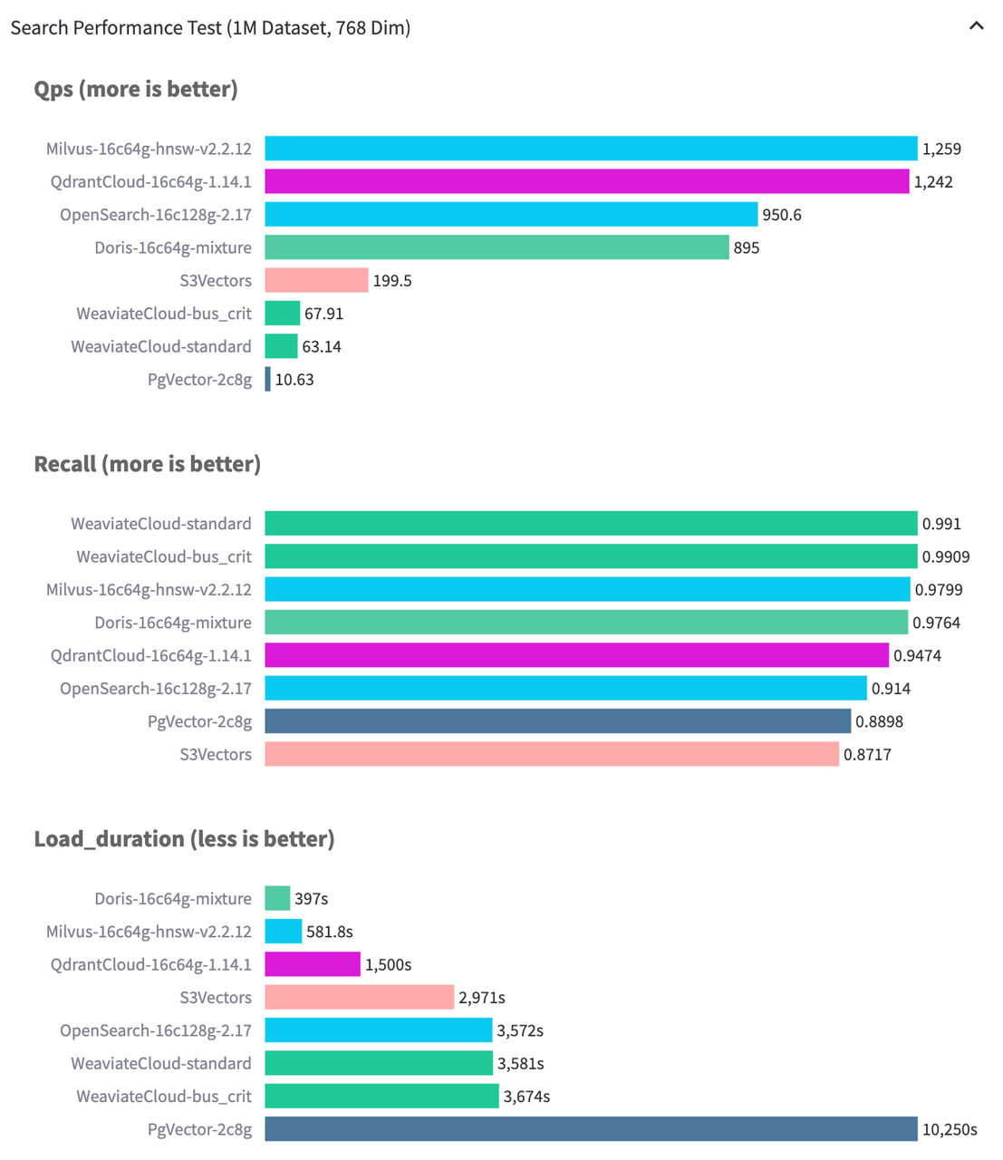 根据 VectorDBBench 公布的数据(截至 2026 年 1 月),Doris 在索引构建速度上优于 Milvus、Qdrant、pgvector 等系统,这一优势主要得益于其数据分层架构。